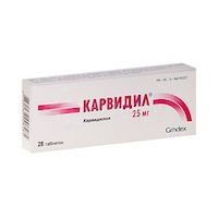 Фармакологическое действиеБлокирует альфа1-, бета1- и бета2-адренорецепторы, оказывает вазодилатирующее, антиангинальное и антиаритмическое действие. Вазодилатирующий эффект связан главным образом с блокадой альфа1-адренорецепторов. Благодаря вазодилатации снижает ОПСС. Не имеет собственной СМА, обладает мембраностабилизирующими свойствами. Сочетание вазодилатации и блокады бета-адренорецепторов приводит к следующим эффектам: у больных с артериальной гипертензией снижение АД не сопровождается увеличением ОПСС, не снижается периферический кровоток (в отличие от бета-адреноблокаторов). ЧСС снижается незначительно. У больных ИБС оказывает антиангинальное действие. Уменьшает пред- и постнагрузку на сердце. Не оказывает выраженного влияния на липидный обмен и содержание K+, Na+ и Mg2+ в плазме. У пациентов с нарушениями функции ЛЖ и/или СН благоприятно влияет на гемодинамические показатели и улучшает фракцию выброса и размеры ЛЖ. Снижает риск смерти больных с декомпенсированной ХСН (на 65%) и частоту госпитализаций (на 38%). При умеренной ХСН снижает риск смерти на 28%. Эффект больше выражен у пациентов с тахикардией (ЧСС более 82 уд/мин) и низкой фракцией выброса (менее 23%). Терапевтический эффект проявляется при ХСН ишемической этиологии и у больных с дилатационной КМП. Побочные действияСо стороны нервной системы: головная боль, головокружение, потеря сознания, миастения (чаще в начале лечения), нарушения сна, депрессия, парестезии. Со стороны ССС: брадикардия, ортостатическая гипотензия, стенокардия, AV блокада, редко - "перемежающаяся" хромота, окклюзионные нарушения периферического кровообращения, прогрессирование СН. Со стороны пищеварительной системы: сухость слизистой оболочки полости рта, тошнота, боль в животе, диарея или запоры, рвота, повышение активности "печеночных" трансаминаз. Со стороны органов кроветворения: тромбоцитопения, лейкопения. Со стороны мочевыделительной системы: тяжелые нарушения функции почек, отеки. Аллергические реакции: кожные аллергические реакции (экзантема, крапивница, зуд, высыпания), обострение псориатических высыпаний, чиханье, заложенность носа, бронхоспазм, одышка (у предрасположенных пациентов), Прочие: гриппоподобный синдром, боли в конечностях, уменьшение слезоотделения, увеличение массы тела. Особые указанияСледует с осторожностью назначать пациентам, работа которых требует быстрой психомоторной реакции (во время работы с машинами и механизмами, при управлении транспортными средствами), больным, использующим контактные линзы (уменьшение слезоотделения). Отмена должна осуществляться постепенно (во избежание развития синдрома "отмены"), в течение нескольких дней (особенно у больных ИБС). При хранении на свету возможно изменение цвета таблеток. Может маскировать симптомы тиреотоксикоза, гипогликемии. Клинический опыт применения карведилола в педиатрической практике отсутствует. В случае необходимости проведения хирургического вмешательства с использованием анестезии необходимо предупредить анестезиолога о предшествующей терапии карведилолом. При прогрессировании СН на фоне лечения рекомендуется увеличить дозу диуретиков, при почечной недостаточности дозу регулируют в зависимости от функционального состояния почек. В период лечения исключается употребление этанола. 
