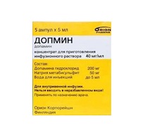 Фармакологическое действиеВозбуждает бета-адренорецепторы (в малых и средних дозах) и альфа-адренорецепторы (в больших дозах). Улучшение системной гемодинамики приводит к диуретическому эффекту. Оказывает специфическое стимулирующее влияние на постсинаптические дофаминовые рецепторы в гладкой мускулатуре сосудов и почках. В низких дозах (0.5-3 мкг/кг/мин) действует преимущественно на дофаминовые рецепторы, вызывая расширение почечных, мезентериальных, коронарных и мозговых сосудов. Расширение сосудов почек приводит к усилению почечного кровотока, повышению скорости клубочковой фильтрации, увеличению диуреза и выведению Na+. Вследствие специфического влияния на периферические дофаминовые рецепторы уменьшает сопротивление почечных сосудов, увеличивает в них кровоток, а также клубочковую фильтрацию, выведение Na+ и диурез; происходит также расширение мезентериальных сосудов (этим действие дофамина на почечные и мезентериальные сосуды отличается от действия др. катехоламинов). В низких и средних дозах (2-10 мкг/кг/мин) стимулирует постсинаптические бета1-адренорецепторы, что вызывает положительный инотропный эффкт и увеличение МОК. Систолическое АД и пульсовое давление могут повышаться; при этом диастолическое АД не изменяется или слегка возрастает. ОПСС обычно не изменяется. Коронарный кровоток и потребление кислорода миокардом, как правило, увеличиваются. В высоких дозах (10 мкг/кг/мин или больше) преобладает стимуляция альфа1-адренорецепторов, вызывая повышение ОПСС, ЧСС и сужение почечных сосудов (последнее может уменьшать ранее увеличенные почечный кровоток и диурез). Вследствие повышения МОК и ОПСС возрастает как систолическое, так и диастолическое АД. Начало терапевтического эффекта - в течение 5 мин на фоне в/в введения и продолжается в течение 10 мин. Побочные действияСо стороны ССС: менее часто - стенокардия, тахикардия или брадикардия, сердцебиение, боли за грудиной, повышение или снижение АД, нарушения проводимости, расширение комплекса QRS, вазоспазм, при применении в высоких дозах - желудочковая аритмия. Со стороны пищеварительной системы: более часто - тошнота, рвота. Со стороны нервной системы: более часто - головная боль; менее часто - тревожность, двигательное беспокойство, тремор. Аллергические реакции: у больных бронхиальной астмой - бронхоспазм, шок. Прочие: менее часто - одышка, азотемия, пилоэрекция, редко - полиурия (при введении в низких дозах). Местные реакции: при попадании препарата под кожу - некрозы кожи, п/к клетчатки.Передозировка. Симптомы: чрезмерное повышение АД, спазм периферических артерий, тахикардия, желудочковая экстрасистолия, стенокардия, диспноэ, головная боль, психомоторное возбуждение. Лечение: в связи с быстрым выведением допамина из организма указанные явления купируются при уменьшении дозы или прекращении введения, при неэффективности - альфа-адреноблокаторы короткого действия (при чрезмерном повышении АД) и бета-адреноблокаторов (при нарушениях ритма). Особые указанияПеред введением больным, находящимся в состоянии шока, гиповолемия должна быть скоррегирована введением плазмы и др. кровезамещающих жидкостей. Инфузия должна проводиться под контролем диуреза, МОК, АД, ЭКГ. Уменьшение диуреза без сопутствующего снижения АД указывает на необходимость уменьшения дозы допами