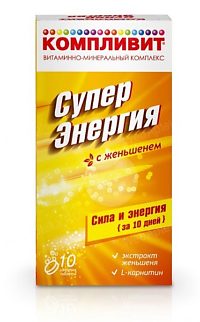 Компливит Суперэнергия с женьшенемПоказания к применениюПрименяется в качестве биологически активной добавки к пище. Состав: Е330, Е500i, магния карбонат, Е296, мальтодекстрин; L-карнитина L- тертрат, аскорбиновая кислота, рибофлавин натрия фосфат, пиридоксина гидрохлорид, тиамина гидрохлорид, цианокобаламин, экстракт корня женьшеня сухой, кальция D пантотенат, фолиевая кислота, никотинамид, биотин, цинка сульфат моногидрат, селенат натрия, ароматизатор пищевой (яблоко), Е955, Е420i, краситель свекла красная. Лекарственная формаШипучие таблетки массой 4,5 г ПротивопоказанияИндивидуальная непереносимость компонентов, артериальная гипертензия, бессонница, повышенная нервная возбудимость, беременность, кормление грудью. Способ примененияВзрослым по 1 шипучей таблетке 1 раз в первой половине дня во время еды, растворив в стакане (200мл) воды.